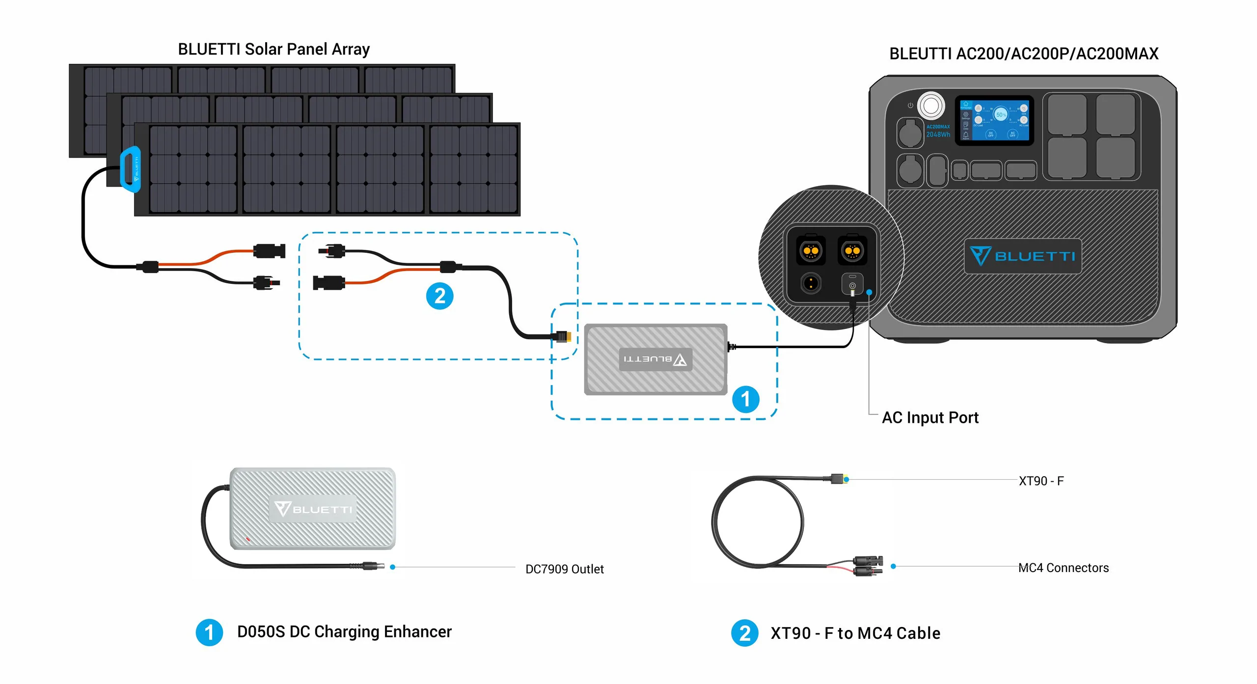 - Zwiększa moc wejściową PV do 1200W dla BLUETTI AC200/AC200P oraz do 1400W dla BLUETTI AC200Max.