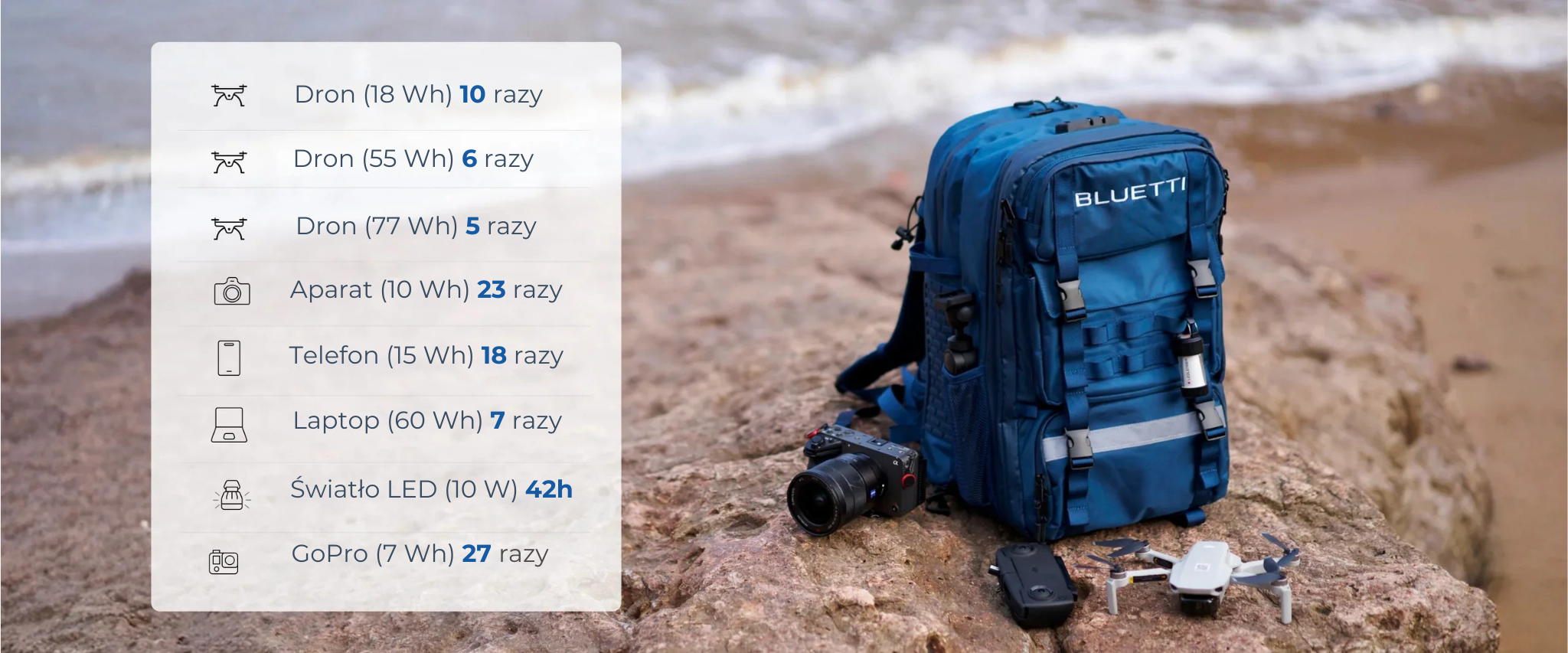 BLUETTI handsfree 2 pozwala ładować do 5 urządzeń jednocześnie, zapewniając niezawodne zasilanie dla Twojego drona, kontrolera, aparatu, smartfona czy laptopa. Dzięki wydłużonemu czasowi pracy baterii, możesz skupić się na rejestrowaniu wyjątkowych chwil i eksplorowaniu nowych miejsc, zamiast martwić się o stan naładowania sprzętu. Zapomnij o konieczności szukania gniazdek czy czekania w kolejce – teraz energia jest zawsze tam, gdzie jej potrzebujesz.